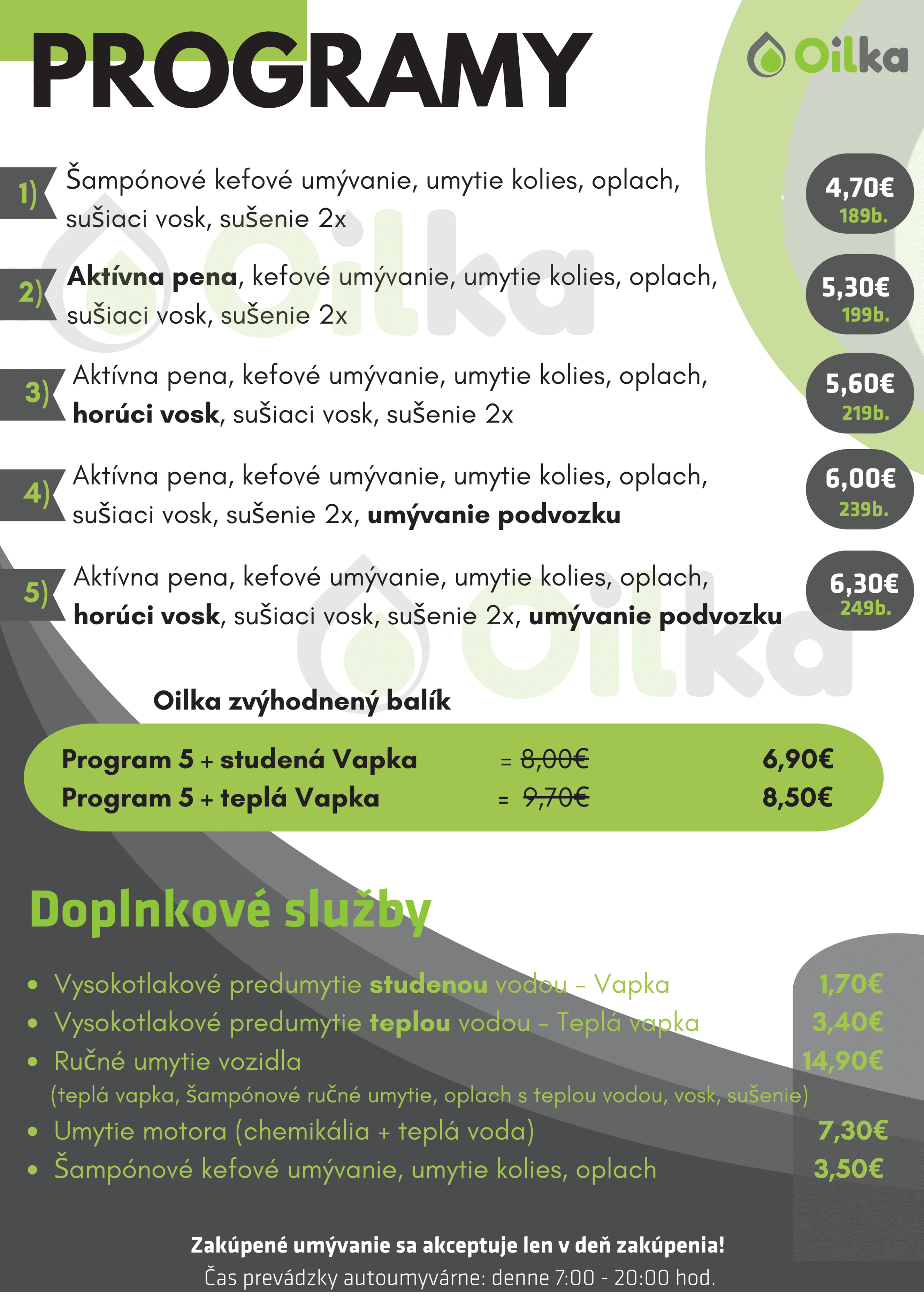 V našej auto umyvárni si môžete vybrať z rôznych programov, ktoré sú prispôsobené presne vašim potrebám. Či už potrebujete rýchle opláchnutie auta, hĺbkové čistenie, alebo voskovanie, u nás si určite vyberiete. Navyše, naše zvýhodnené programy Oilka vám umožnia ušetriť, a pritom získať tú najvyššiu kvalitu služieb.