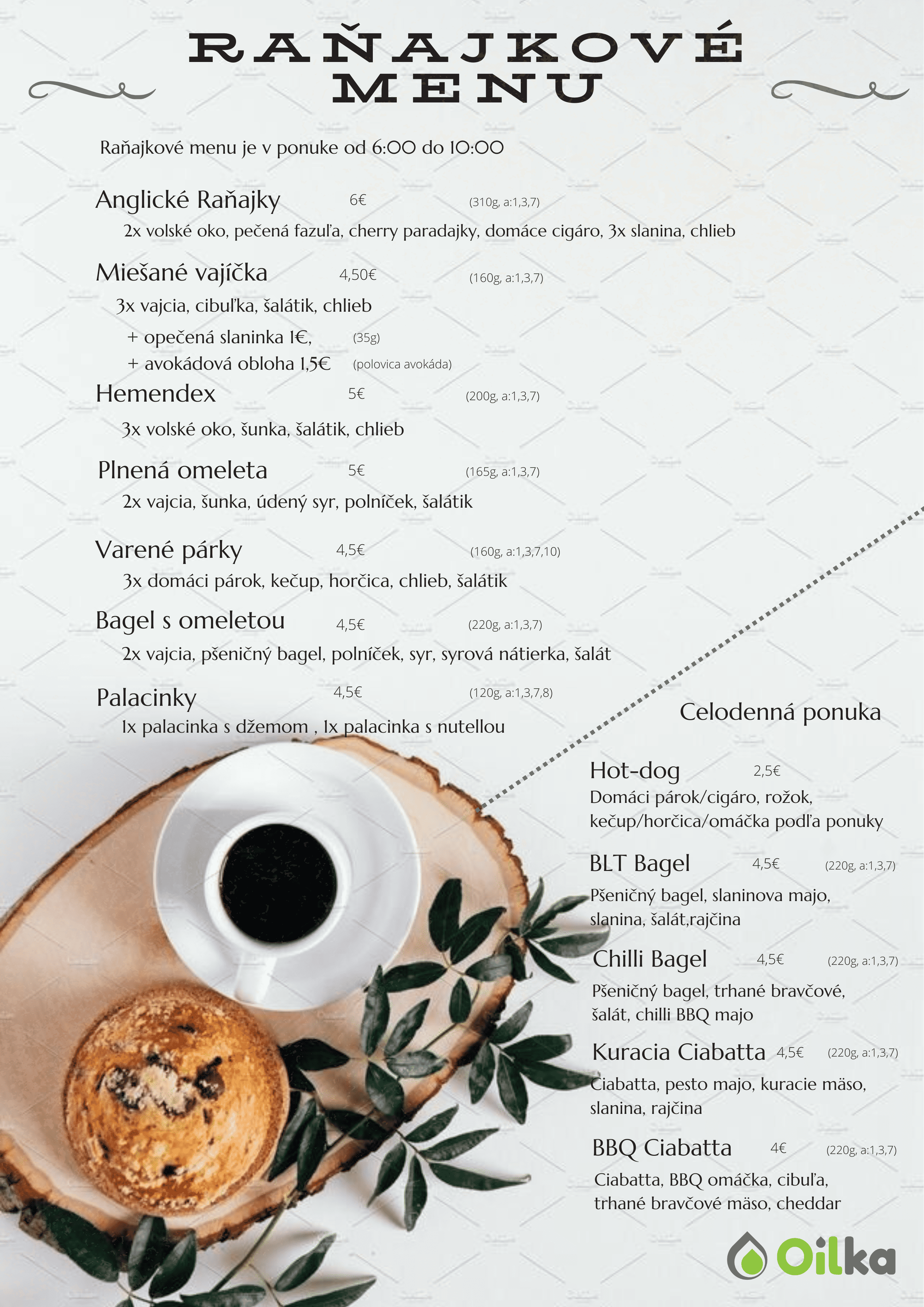 Raňajky sú základom každého úspešného dňa, a my v Oilke to dobre vieme. Preto sme pre vás pripravili širokú ponuku raňajkových menu, ktoré potešia nielen fajnšmekrov, ale aj každého, kto hľadá chutné a výživné jedlo na začiatok dňa.